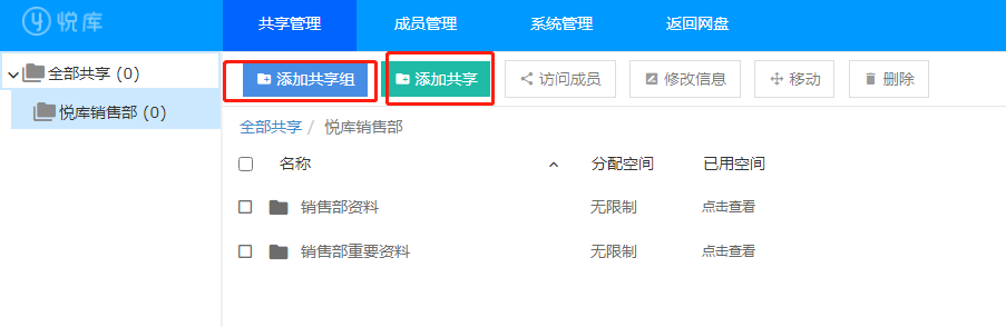 悦库企业网盘共享管理分“共享组”和“共享”,共享组是目录,共享是工共享文件夹。