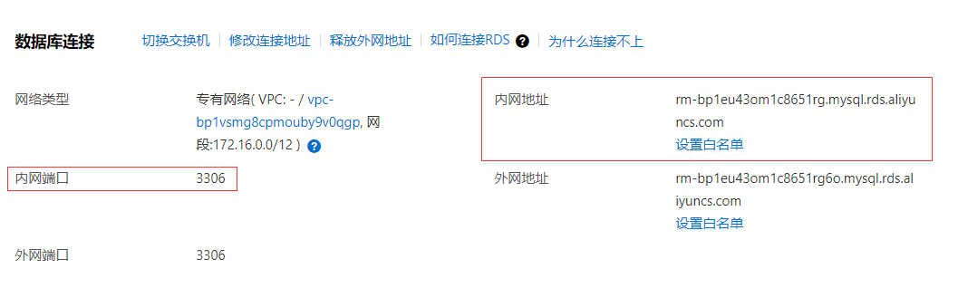 3. 获取数据库内网访问地址 在基本信息中,点击网络类型中的 "查看连接详情"。将内网地址(主机名称)和内网端口(主机端口)复制到文本文件中,后续备用。