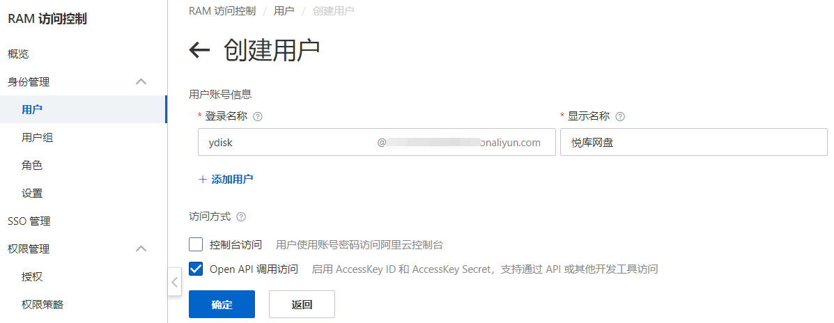 4. 创建RAM(访问控制)用户 点击左侧"权限管理"标签进入"访问控制 RAM"项,打开"RAM访问控制"页面。 创建RAM用户,例如用户名为:"ydisk"; 显示名称为:"悦库网盘"; 访问方式为:"Open API 调用访问"。