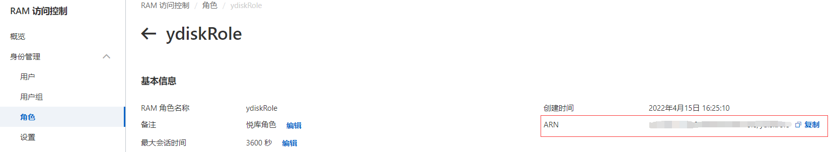 7. 创建RAM角色,并添加权限 创建可信实体为阿里云账号的RAM角色,例如角色名称为:"ydiskRole"。创建成功后,为角色添加"AliyunOSSFullAccess"权限。 复制"ARN",记录到文本文件中,后续备用。