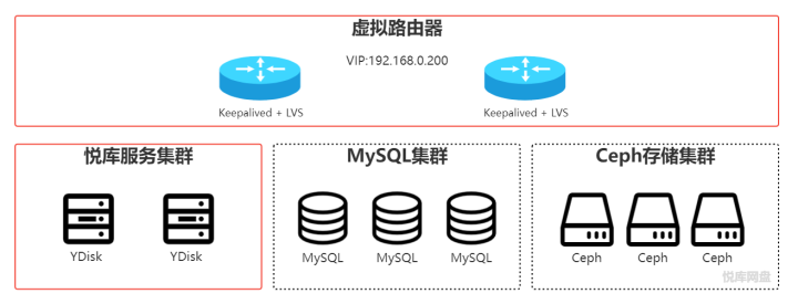 悦库网盘集群化由悦库服务集群、MGR(MySQL Group Replication)集群、Ceph存储集群 以及虚拟路由器 4个子模块组成,本文指导用户搭建悦库服务集群,图中红线框所示: