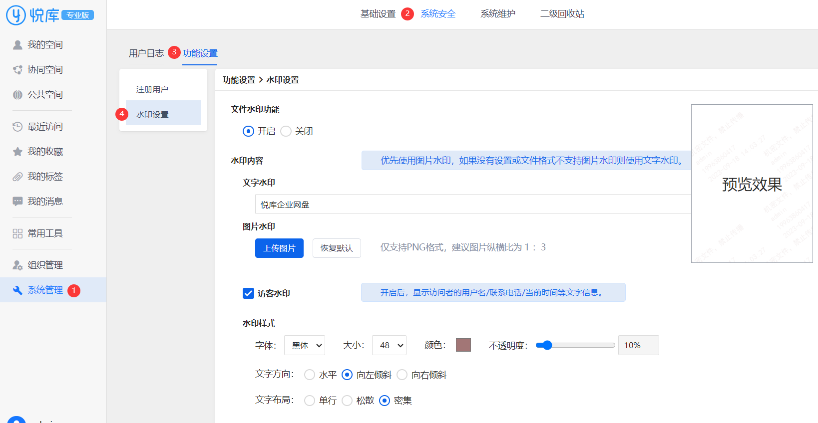 悦库企业网盘文件在线预览时设置水印功能介绍