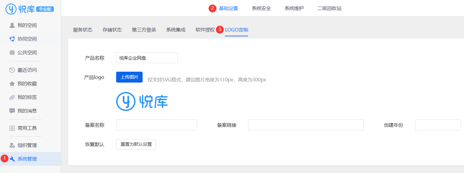 悦库企业网盘(专业版)支持修改产品名称和LOGO,经过精心设计的LOGO和名称在传达品牌核心价值和理念方面起着枢纽作用,可以更好的体现用户单位形象。