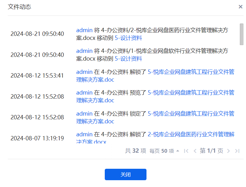 悦库企业网盘的“动态记录”功能,就是你的救星,右键空间或者文件夹,选择动态,就可以看到空间和文件夹的所有操作动态,就可以查找所有的历史记录,包括新建、移动、删除、修改等任意操作,就连是哪个用户进行的操作也会记录在这里。