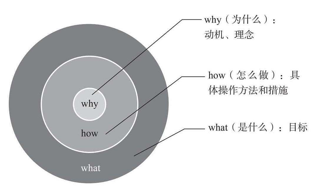 所谓黄金思维圈,其实就是我们认知世界的方式,我们看问题的方式可以分为三个层面---第一层面是what层面,也就是事情的表象,我们具体做的每一件事;第二层面是how层面,也就是我们如何实现我们要做的事情;第三个层面是why层面,也就是我们为什么要做这样的事情。