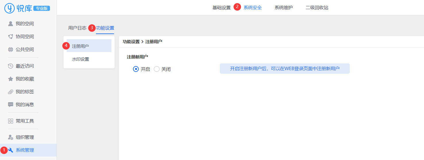 4、开启注册用户功能入口(专业版):【系统管理】-【系统安全】-【功能设置】-【注册用户】
